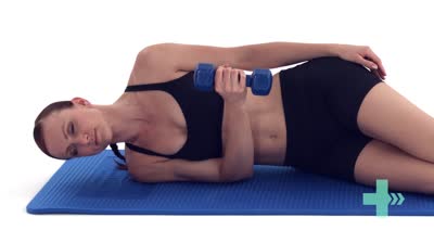 Legen Sie sich auf die betroffene Seite. Halten Sie ein Gewicht in der Hand und beugen Sie den Ellenbogen auf 90 Grad. Drehen Sie den Unterarm nun zum Bauch, sodass Sie das Gewicht vom Boden abheben. Kehren Sie kontrolliert zurück in die die Ausgangsposition.